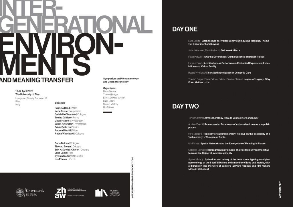 The workshop on phenomenology and urban morphology (held at the Husserl Archive, Cologne, 12-13 April 2024), dedicated to typification in human experience, identified several areas of common interest among the diverse group of participants, which can facilitate the integration of disciplines and methodologies. Starting from the issue of typification, we went further. In general, a productive connection between (Husserlian) phenomenology, enactivism and anthropology with morphological methods such as the typological-processual or space syntax approaches can be established through the concepts of embodied cognition, familiarity, generativity, horizon, habit, type and lifeworld, paving the way towards intergenerational environments and cultural meaning transfer.
